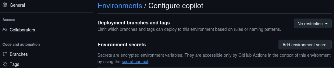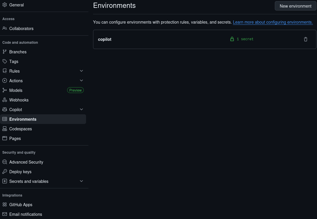 El token creado nos lo llevaremos a "Settings" -> "Environments" de nuestro repositorio. Ahí deberíamos ver el entorno "copilot", entraremos dentro y añadiremos el PAT como "environment secret".