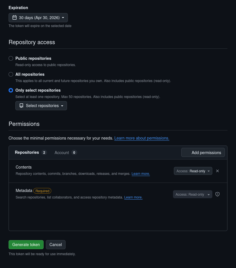 Primero tendremos que crear un "Personal Access Token" y dar permisos de solo lectura a los repositorios que queramos usar como dependencia en los términos "Metadata" y "Contents" (necesarios para clonar el repositorio).